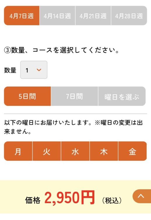 「曜日を選べるコース」は、1食あたり40円アップします。